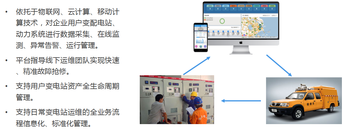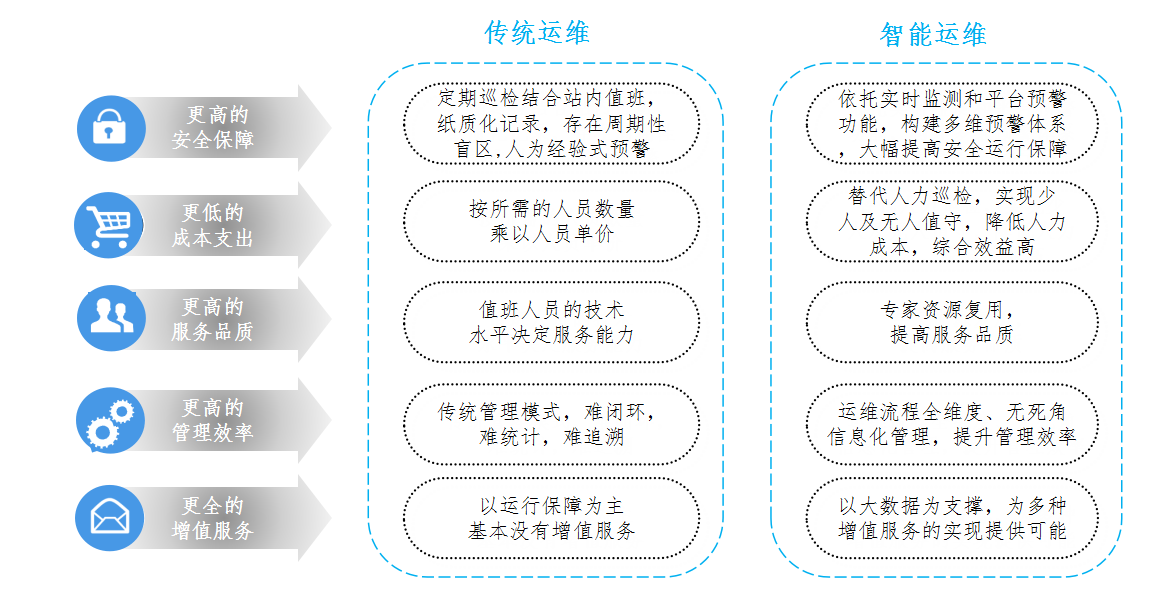 “智能運維”也叫“智能電力運維服務”,是傳統電力運維結合“互聯網+”技術以及共享思維而產生的新型電力管理模式,通過線上平臺+線下運維團隊+APP,構建新的運維服務支撐體系,有效提升變電站運行的安全、效率和經濟性。